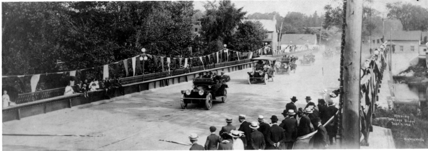 It is the day of the official opening of Billings Bridge, September 2, 1915. A large crowd has gathered including City engineer Askwith, Gloucester Reeve Caleb Hardy, his council and county officials, and Brad Billings, the so called 'King of Billings Bridge'. The bridge is brightly decorated with red, white and blue cheesecloth streamers and flags borrowed from the Exhibition association. The bridge is roped off at both ends and also decorated in preparation for an official ceremony. Cars are rounded up including the fire chief's car and the mayor's private vehicle. City controllers and councillors and newspapermen are assembled in the cars and they rush south from the city to the bridge. Without getting out of his car, Ottawa Mayor Nelson Porter cuts the rope and drives across the bridge with the other vehicles. After driving a short distance, they turn around and drive north across the bridge with the mayor briefly stopping. He insists that no speeches will be made and he quickly departs. What appears in the photo as a specially scripted event turned out to be totally underwhelming. [Ottawa Journal, September 3, 1915 p.14]