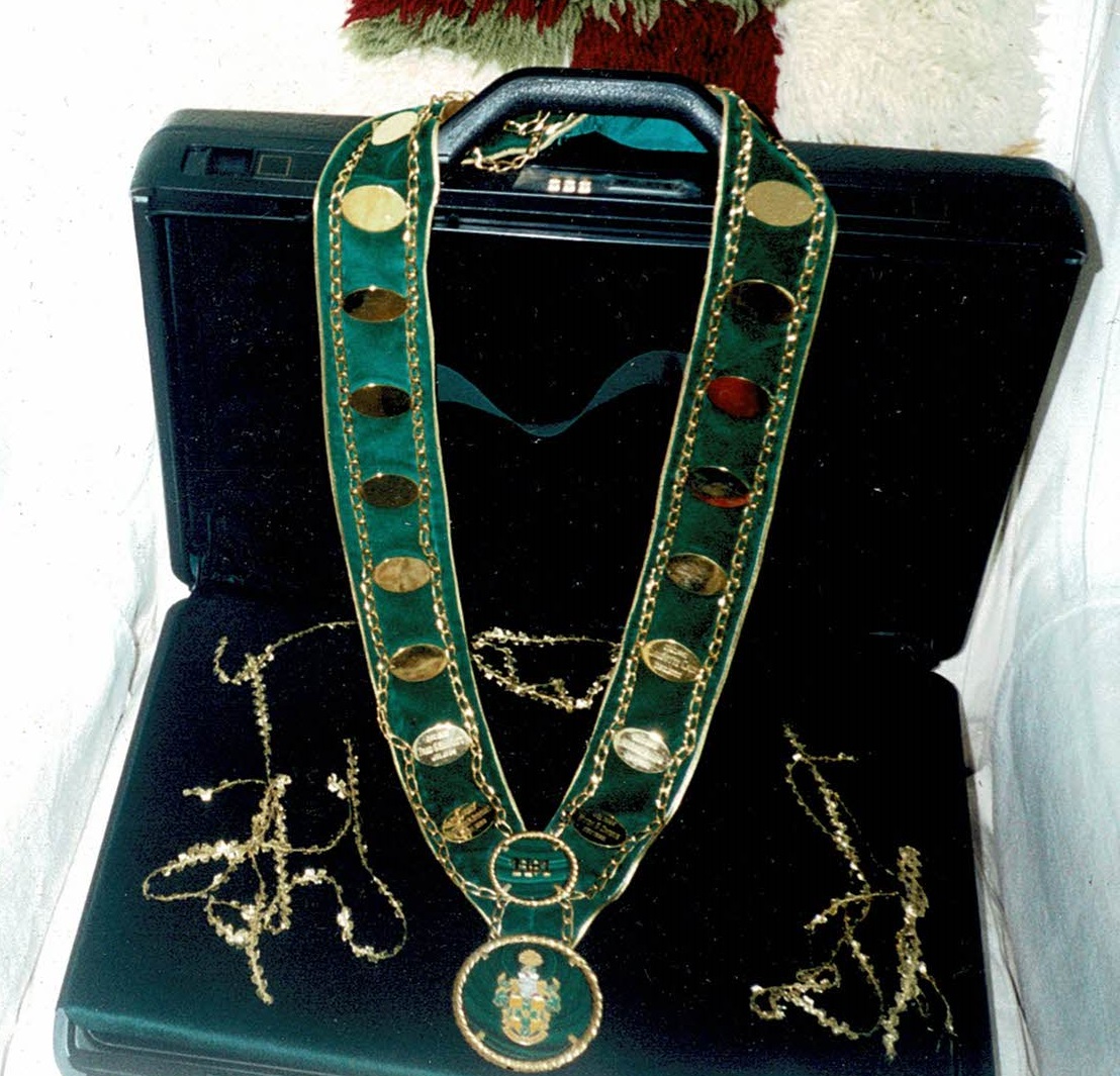 The chain was originally presented to former Gloucester Mayor Harry Allen on March 25, 1988 by page Erinn O’Brien, then age 8 at the Gloucester council chamber.  It features 20 gold medals on a green velvet backing with the name of each mayor engraved on the medallions since the city was incorporated in 1981.  The bottom of the chain features a 3-inch malachite medallion including a full colour version of the Gloucester Coat of Arms.