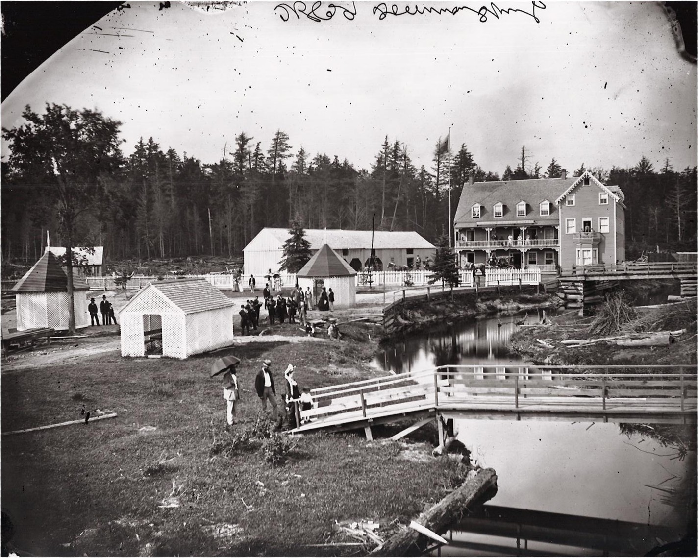 the Month - April 2012 In 1868 a group of seven business men from Ottawa formed joint stock company called the “Dominion Stock Compamy” . They bought 40 acres of land including the “spring grounds” from Sam Eastman. They built a substantial hotel called the Dominion House. They had the mineral grounds improved, a pump house built, and kiosks were added over five of the Springs and a foot bridge was added from the spring grounds over the Bearbrook creek. Also built was a small steeple chase course, which of course attracted the sporting crowd from Ottawa. They operated a stage coach line out the Russell Road from Ottawa to the Springs during the summer months. At that time the only mode of travel was by horseback, stage coach or buggy etc. (The bridge in the background runs Russell Road over Bearbrook Creek) The names of the men who started this venture were: The “Dominion House” operated quite successfully for a number of years until it was destroyed by fire. The photograph also shows a metal fountain that could be set on fire at night because the amount of gas that was produced with the water at the site. Unlike later hotels built at this location, this hotel did serve liquor. It is rumoured that Sir John A. MacDonald stayed at this hotel. |